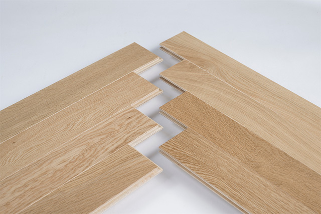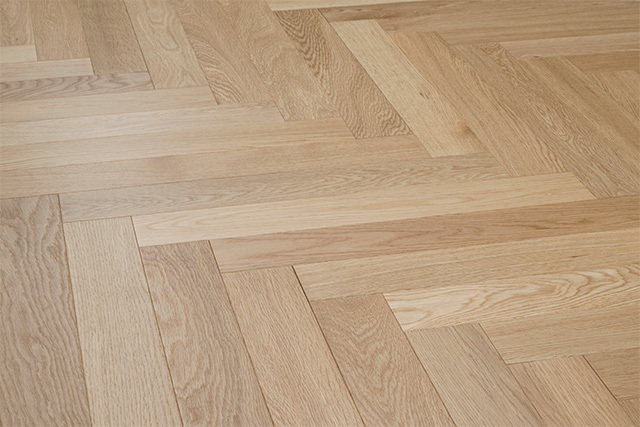 樹種は、住宅・店舗ともに人気の高いオーク。ナチュラルな木目が特徴で北欧テイストやナチュラルな住宅デザイン、リノベーションにも使いやすい床材です。表面はUVマット塗装を採用。落ち着いた質感とともに耐久性やメンテナンス性にも配慮しています。基材にはバーチ合板を使用することで、反りや収縮が起こりにくく、施工性に配慮した仕様です。ヘリンボーンならではのデザイン性で、住宅のリビングや玄関ホール、店舗空間のアクセントとしてお使いいただけます。