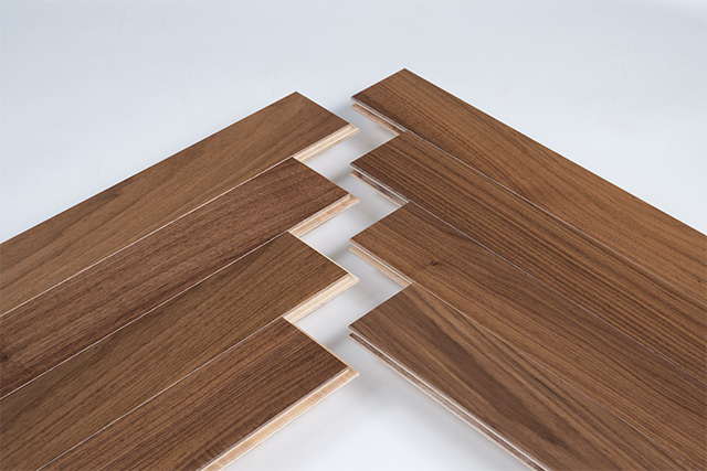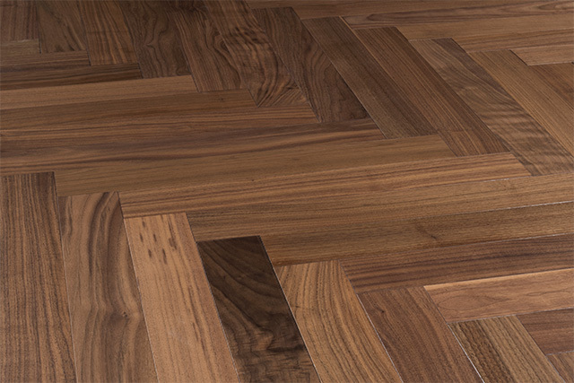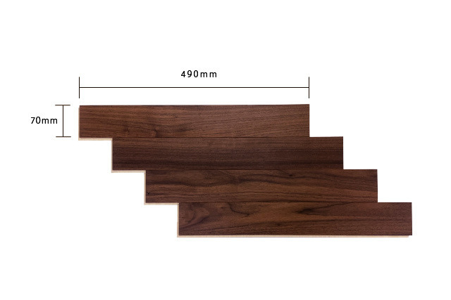 樹種は、深みのある色合いと高級感が魅力のブラックウォールナット。モダン住宅や店舗空間におすすめです。表面はUVマット塗装を採用。落ち着いた質感とともに耐久性やメンテナンス性にも配慮しています。基材にはバーチ合板を使用することで、反りや収縮が起こりにくく、施工性に配慮した仕様です。ヘリンボーンならではのデザイン性で、住宅のリビングや玄関ホール、店舗空間のアクセントとしてお使いいただけます。